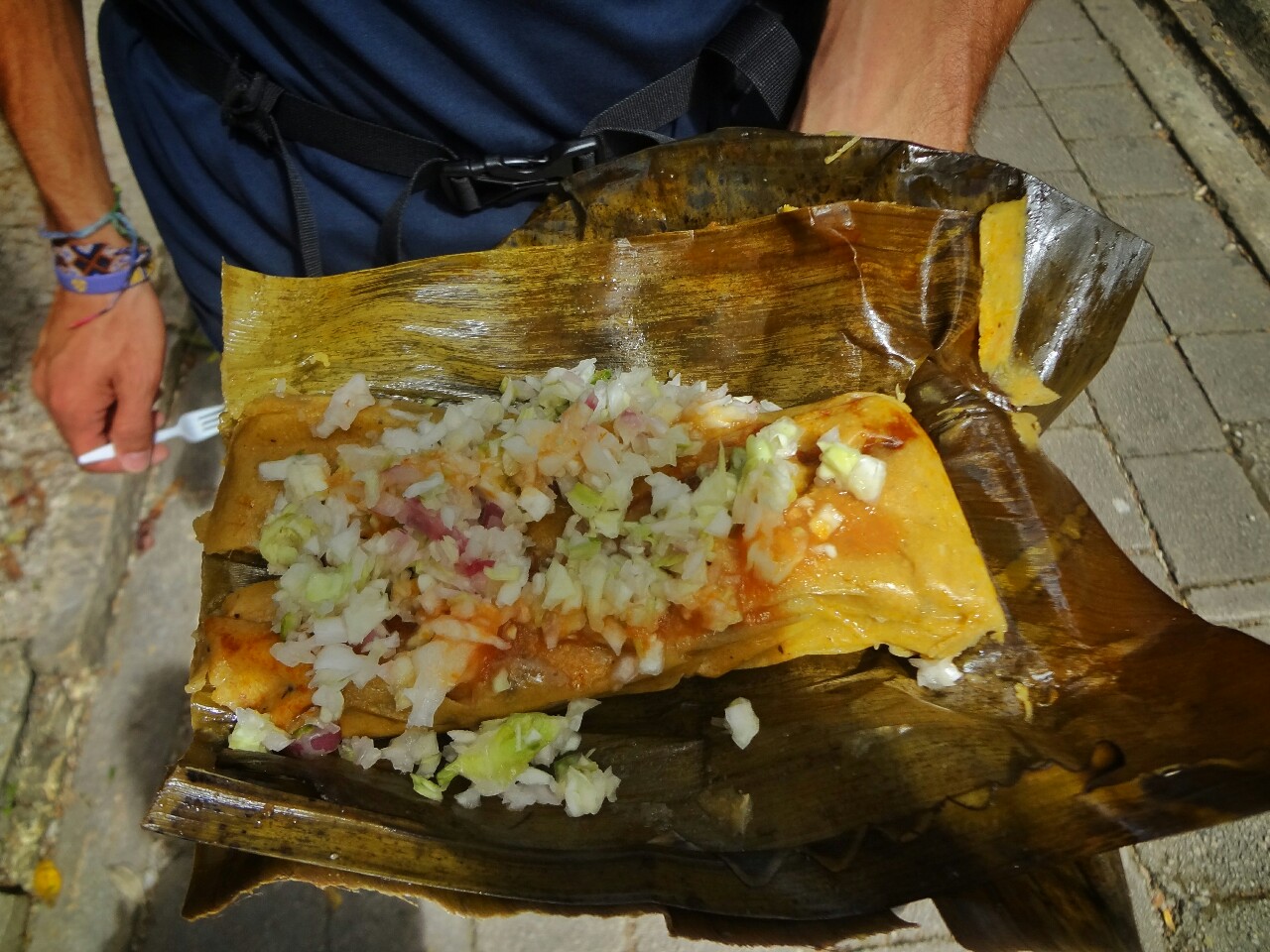 Omeniti moram še Guacamole, namaz iz avokada (spodaj levo) in tamal (spodaj desno.) Tamal je neke vrste polenta, polnjena s mesnim ali zelenjavnim nadevom in pečena v bananinem ali koruznem listu. V mojem primeru je posuta še s čebulo ter minimalno količino maksimalno pekoče omake. Tamal in večina mehiških jedi, izvira iz majevske civilizacije.
