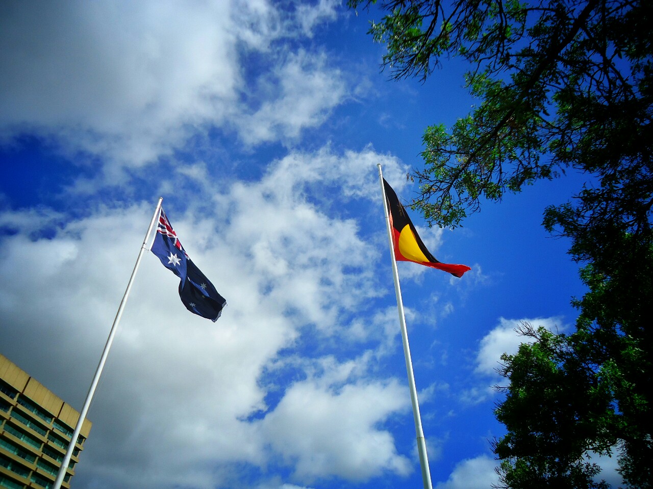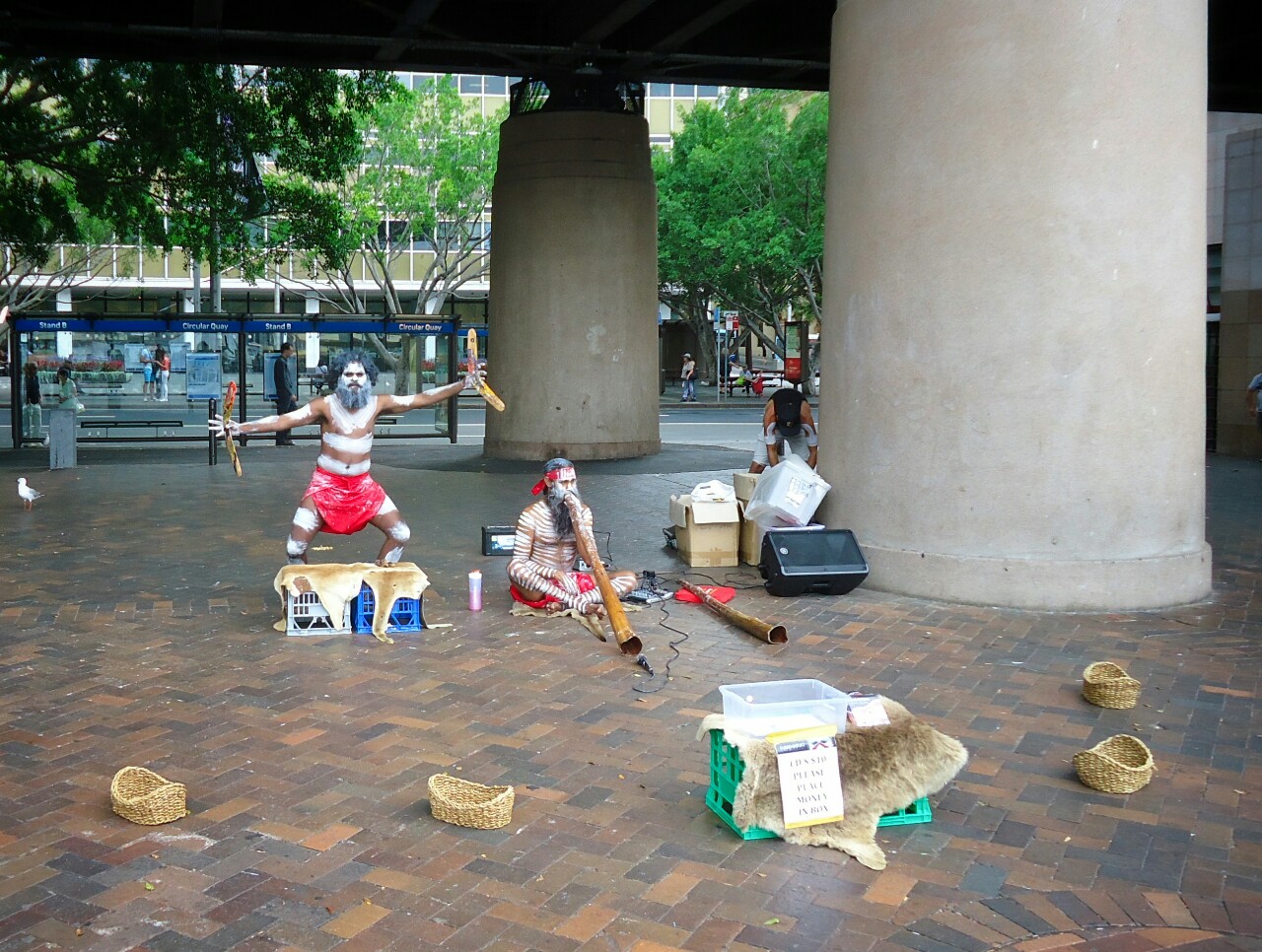Ne samo živali, tudi ljudje so tukaj drugačni. Oziroma, moram se popraviti, nekoč so bili drugačni. Aboriginov - prvotnih prebivalcev Avstralije je danes ostalo bore malo. Edine, ki sva jih uspela videti, so bili ulični umetniki na sliki spodaj levo. Kolikor sva uspela izvedeti od lokalnih prebivalcev, še danes veljajo za manj vredne. Večina jih živi od socialnih prispevkov, ki jih porabijo za alkohol. Država poskuša popraviti krivice, a zgolj z izobešanjem aboriginske zastave (spodaj desno) ob bok nacionalni zastavi ne reši veliko. Optimizem vlije kak posameznik (belec), ki reče da vedno več ljudi podpira ideje, da bi rdeče-črno-rumena aboriginska zastava zamenjala uradno zastavo države, saj britanski "Union Jack" več ne predstavlja sodobne Avstralije.