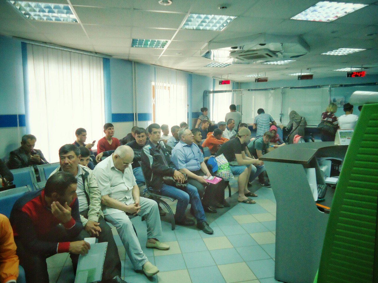 No, slaba stran potovanja po Rusiji, je registracija. Če se v nekem mestu ustaviš za več kot 7 delovnih dni, se moraš registrirati na lokalnem migracijskem uradu (slika spodaj levo.) In če ste mislili, da je slovenska birokracija obupna, vas povabim v Rusijo :) Ko vstopiš je čakalnica polna uzbekov, tadžikov, turkmenov... Ti pridejo v Rusijo opravljati manj zaželjena dela, zaradi brezposelnosti v svojih državah. Zato čakaš pol ure samo, da dobiš obrazec, ki ga moraš izpolniti. Potem čakaš pol drugo uro, da dobiš listič s številko, na podlagi katere se končno lahko postaviš v vrsto za okence, kjer boš opravil registracijo. Po pol ure nadaljnjega čakanja se nad okencem prižge tvoja številka. Hura, skoraj pri koncu, ampak ne še čisto, ker še samo postopek registracije traja dobrih 15 minut. Čakalnica je bila natrpana, ampak, ko sem jo zapustil, se mi zdi, da sem poznal vsakega izmed čakajočih :)