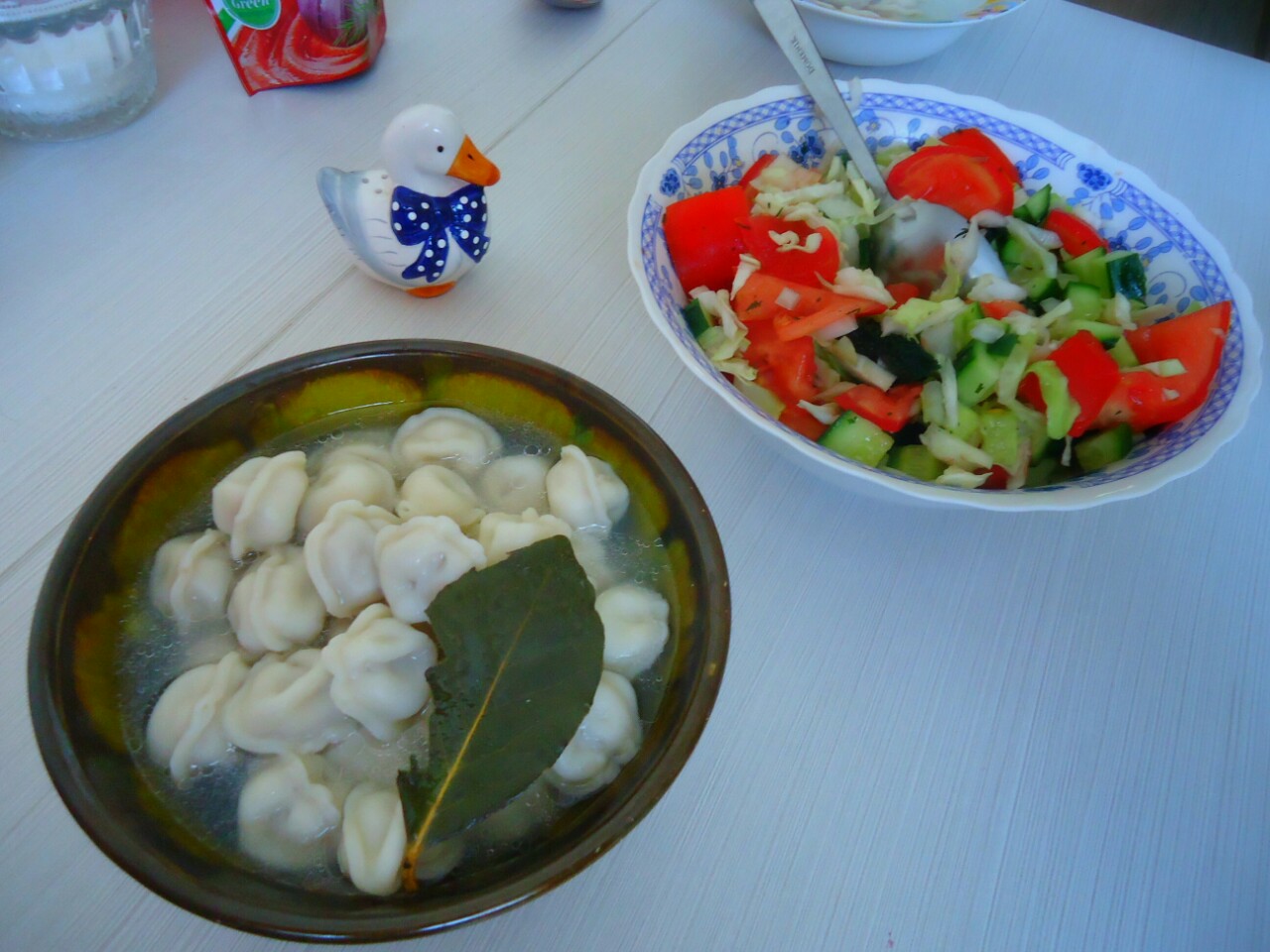 Počasi se mi že izteka ruska viza, pa še nisem omenil lokalne gastronomije. Torej, za rusko kuhinjo so zelo značilne juhe na milijon načinov. Spodaj ribja juha Uha (levo) in boršč (desno). Še nižje levo so Peljmeni. Ne ravno tradicionalno rusko, ampak jih je potrebno omeniti, zaradi svoje priljubljenosti. Mi bi jim verjetno rekli ravioli, čeravno okus vseeno ni identičen temu, kar sem bil navajen. Skrajno desno pa še Pirog. To je testo v katerem se skrivajo različni nadevi. V konkretnem primeru, čebula in jajca.
