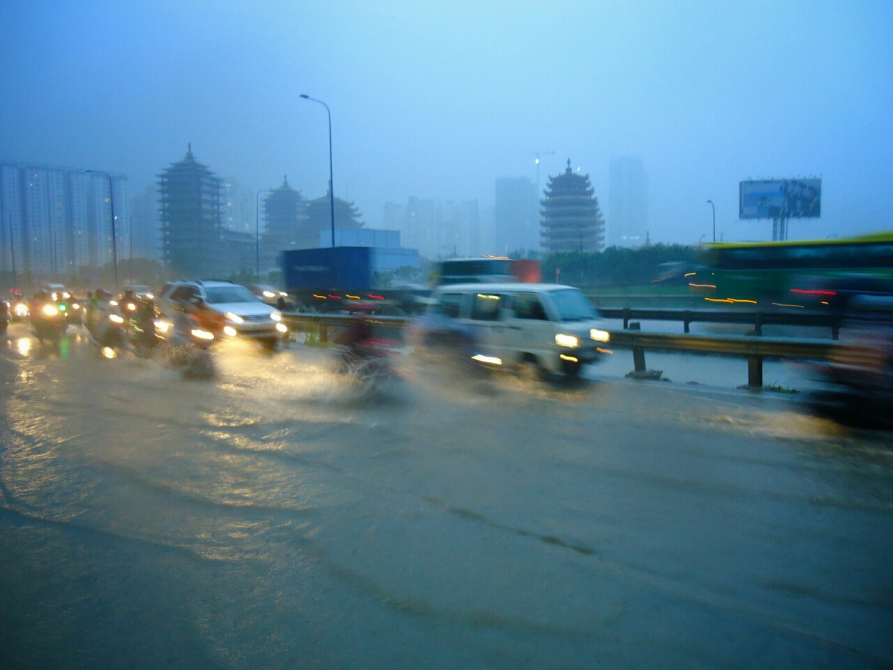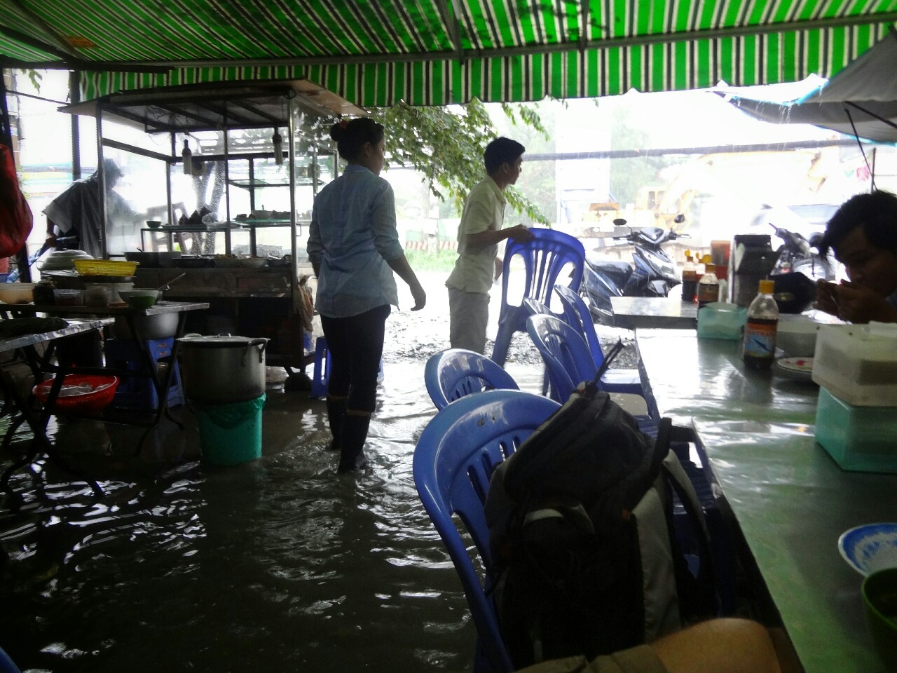 Here we also got catched by the first tropical storm. A nice sky turned overcast in 5 minutes. And after half of an hour we could make only the shots like the one below left. Even the local restaurant can't assure us enough shelter to stay all dry.