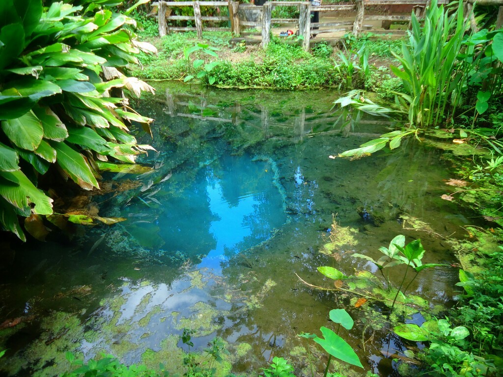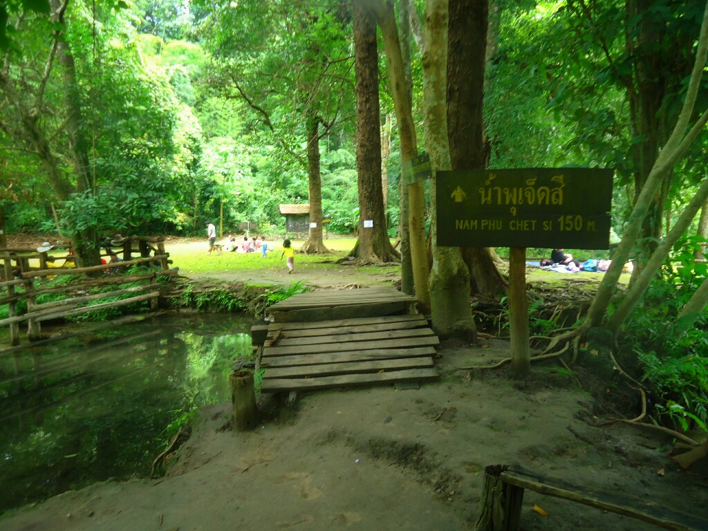 But waterfall is not only interesting place around. Just a couple of minutes away is a spring with amazingly blue water. It's located by the smaller shrine and it's even less crowded than the waterfall. To access it just find the way left of the waterfall. It's clearly marked with signpost: Nam Phu Chet Si but on the map above it's shown as Yetsee hot spring.
