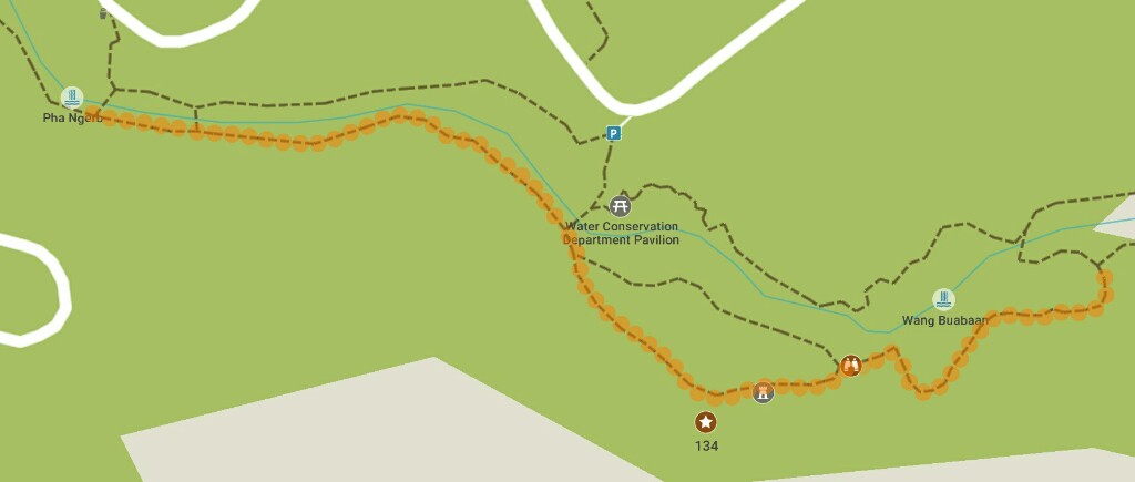 Then just return to that point the same way and continue towards Pha Ngerb. The way gets steeper and leads you passing a smaller shrine (marked with grey fortress sign on map bellow) and Water Conservasion Department Pavilion (grey picnic sign on map below.) Last one is on the other side of the river/stream and it's a nice place to rest and admire the view.