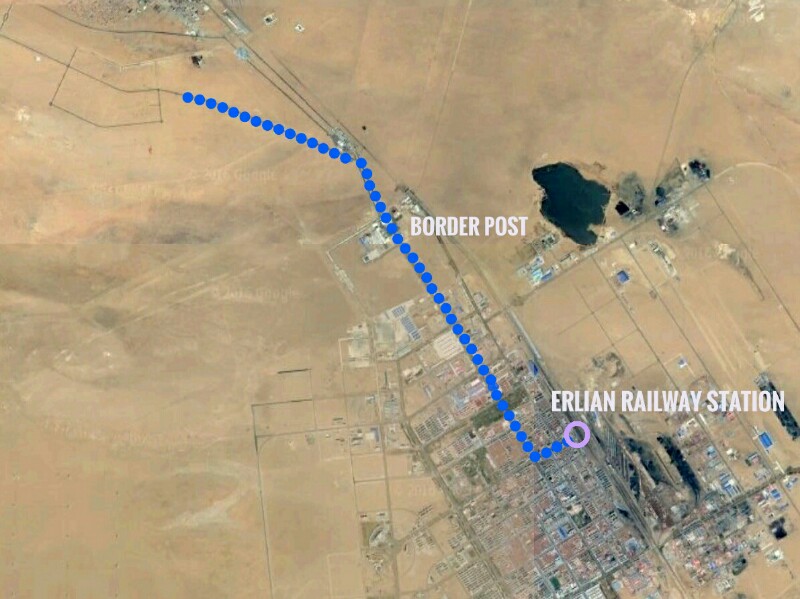 When arriving to Zamiin-Uud you have to somehow get to Erlian train station on chinese side of the border. Erlian can be spelled also as Erenhot on some maps. It's not possible to cross the border on foot. When walking out of the station you'll already see busses on a parking lot. They cost 15,000 MNT. But there will also be taxis or just some random people offering you a ride. You have to negotiate because the initial price can be as high as 45,000 MNT, but if you show the driver that you know what the expected price is you can easily negotiate to 10,000 MNT. I even heard stories about people getting a ride for 8000 MNT.