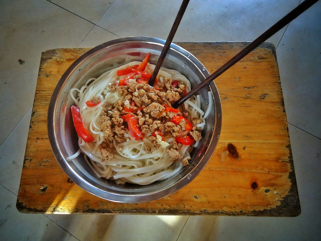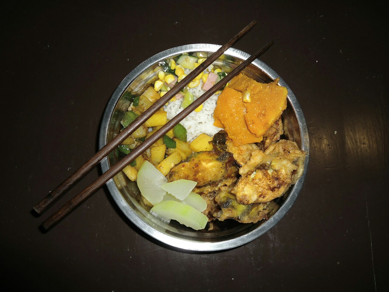 Dolžan sem vam narediti še nekaj luštov. Za zajtrk so bili običajno riževi rezanci z nečim. Na sliki desno z mesom in sladkim čilijem. Za kosilo in večerjo, pa je miza izgledala, kot na sliki desno. Vedno je bil na razpolago riž v neomejenih količinah, ki si si ga potem obogatil z različnimi nadevi. In ko vse skupaj zbašeš v krožnik dobiš sliko spodaj levo. Od zelenjave se veliko uporabljajo različne vrste buč, jajčevcev, paprik, čilijev, paradižnikov, navadnega in sladkega krompirja, koruze, arašidov in drugih oreškov... Od mesa pa prevladujejo bolj pernate živali. Spodaj desno kuharca ravno tamani neko raco :)