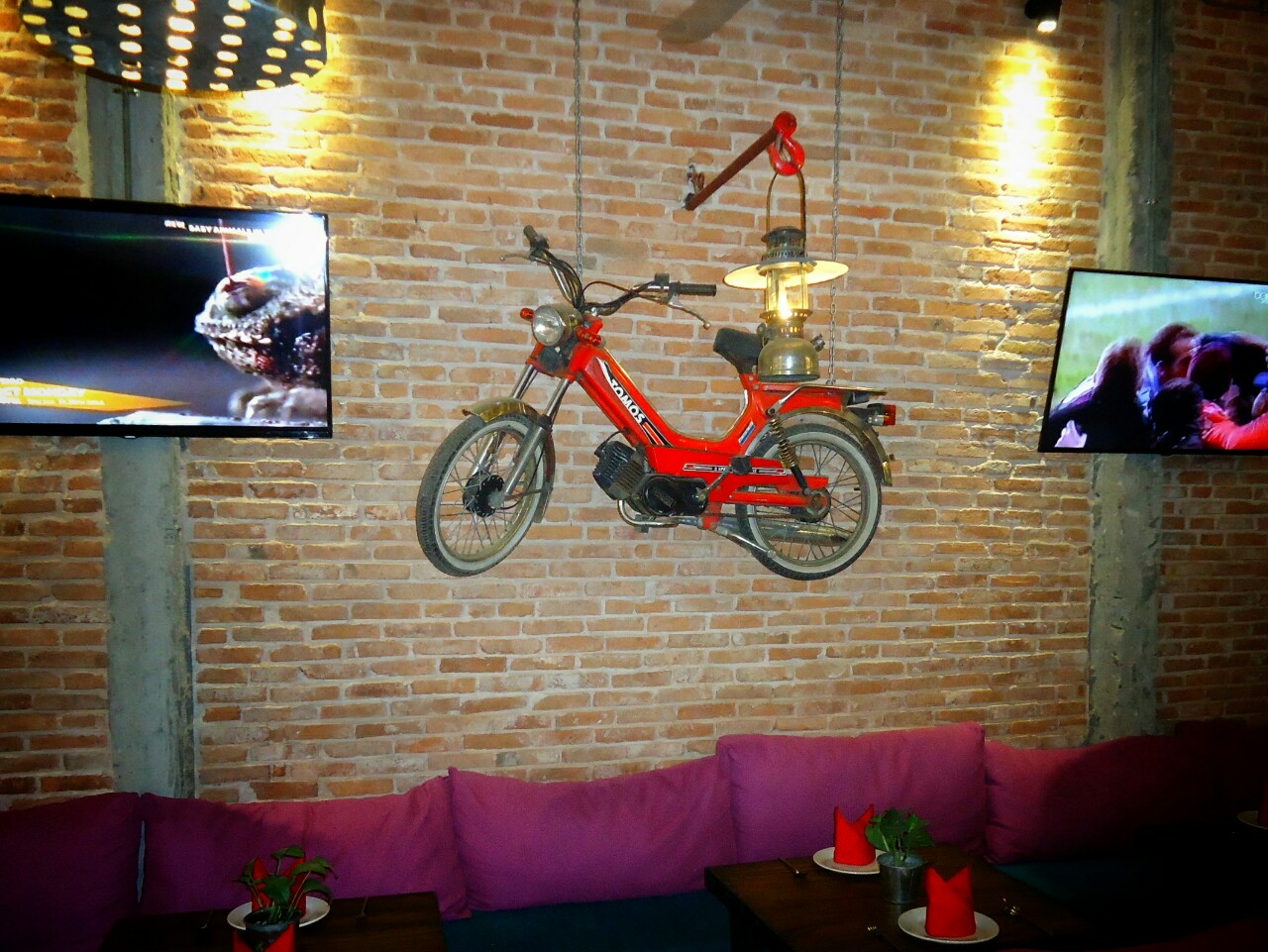 Motorjev je, v primerjavi z vzhodno sosedo, v Kambodži manj. Zato še bolj začudi, ko med njimi najdeš kakega domačega. Pa četudi na steni kavarne.