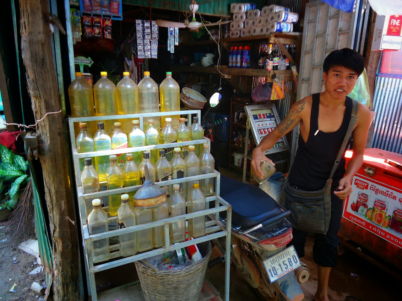 V Vietnamu sem se čudil nad improviziranimi bencinskimi črpalkami in mislil, da sem videl vse. A sem se motil. Tukaj liter 95-oktanskega kupiš v steklenici Johnny Walkerja. Black Label seveda.