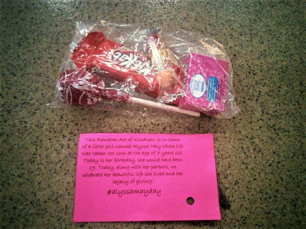 Ko vendarle odmaknem pogled od tabličnega računalnika, pred sabo zagledam improviziran zavojček bonbonov in sporočilo. Začnem brati. Začelo se je nekako tako: "To je naključno dejanje dobrote v čast deklici po imenu Alyssa May, kateri je bilo življenje odvzeto prezgodaj ..."
